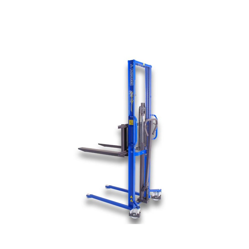 Alfa M è il carrello elevatore a traslazione ed elevazione manuale: il sollevamento delle forche avviene tramite pompa manuale ad alzata rapida mentre la discesa è regolata dalla leva posta sul timone.